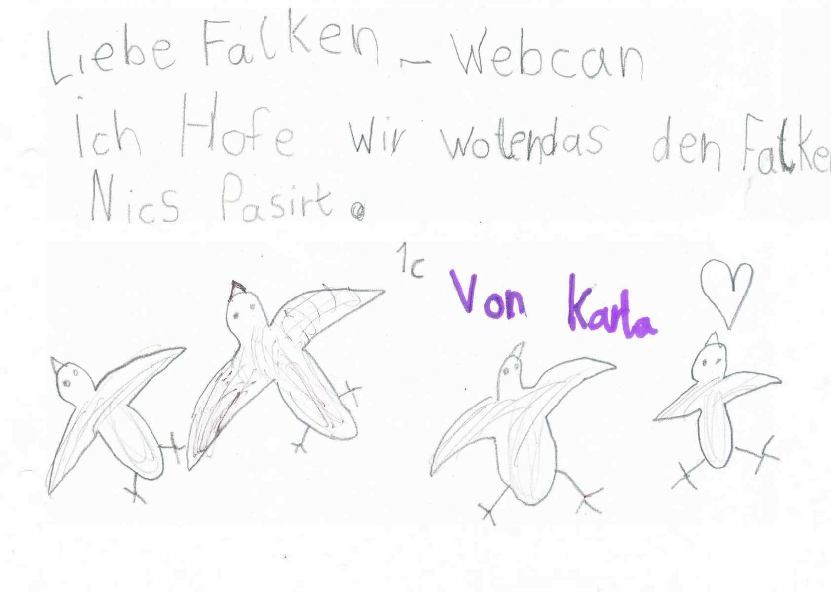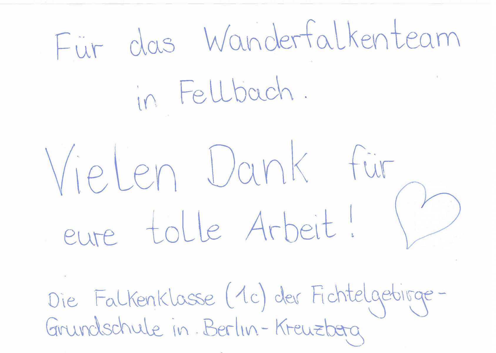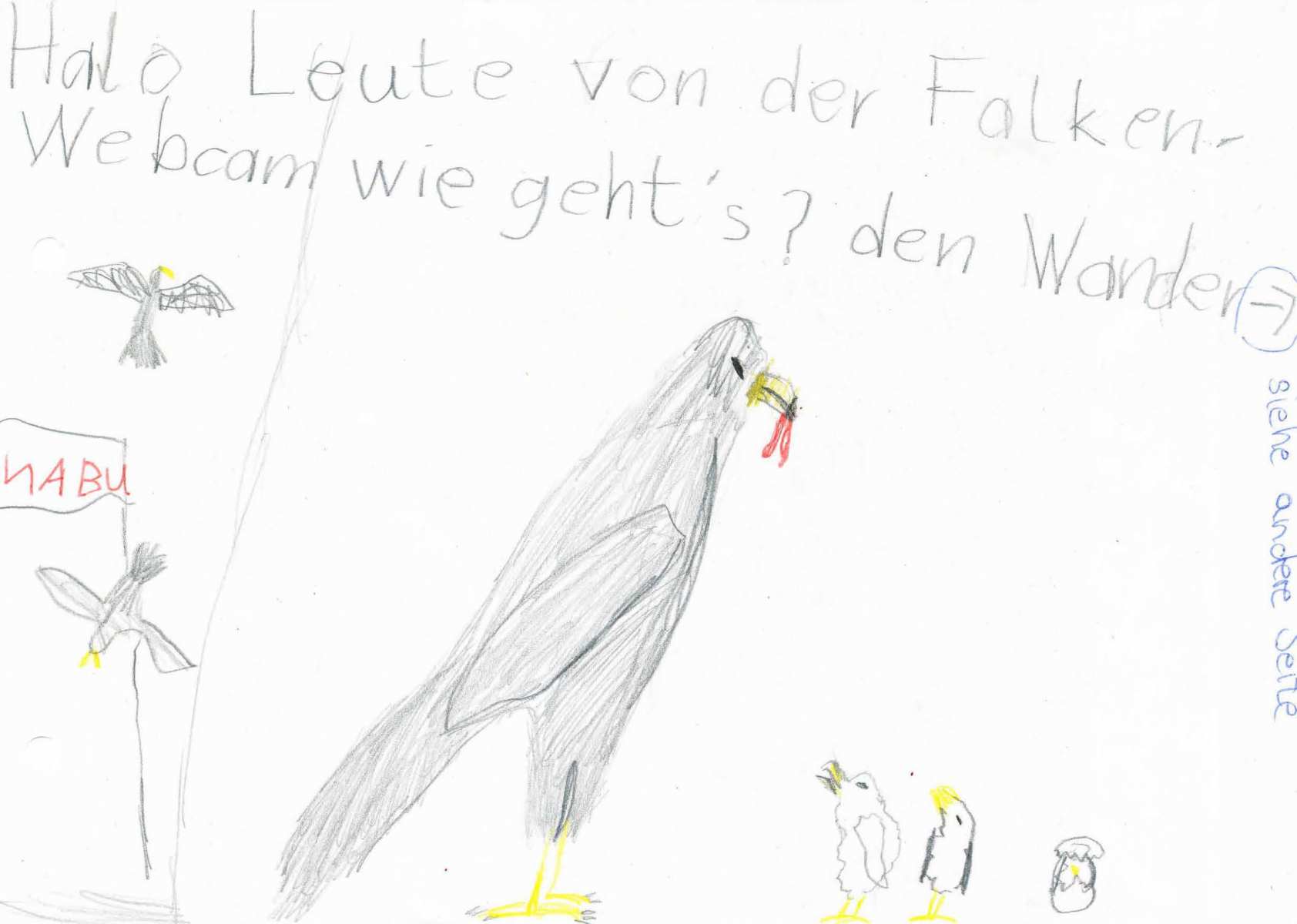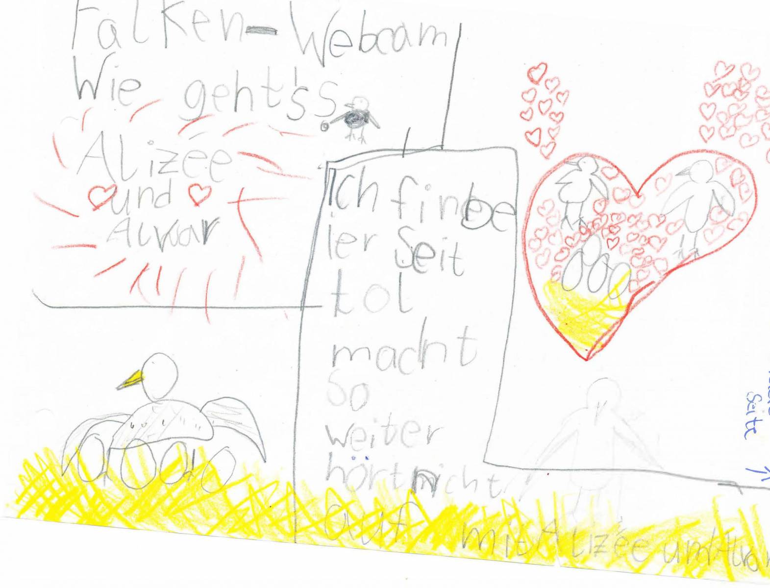 Zu Beginn der Sommerferien haben wir ein schönes Feedback bekommen. Die Falkenklasse 1c der Fichtelgebirgs-Grundschule in Berlin-Kreuzberg hat uns einen Brief geschickt. Sie schauen wärend des Unterichts regelmäßig bei unseren Wanderfalken zu und begleiten deren Entwicklung.