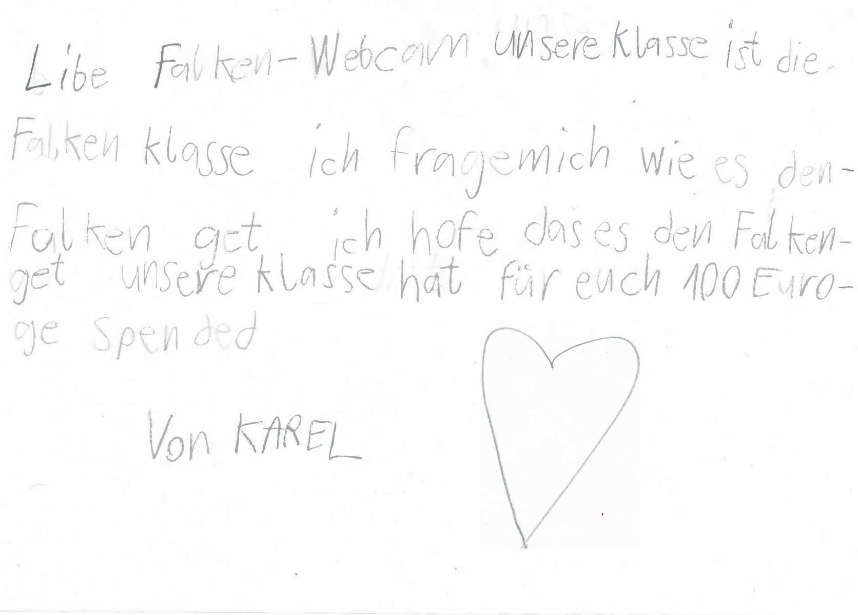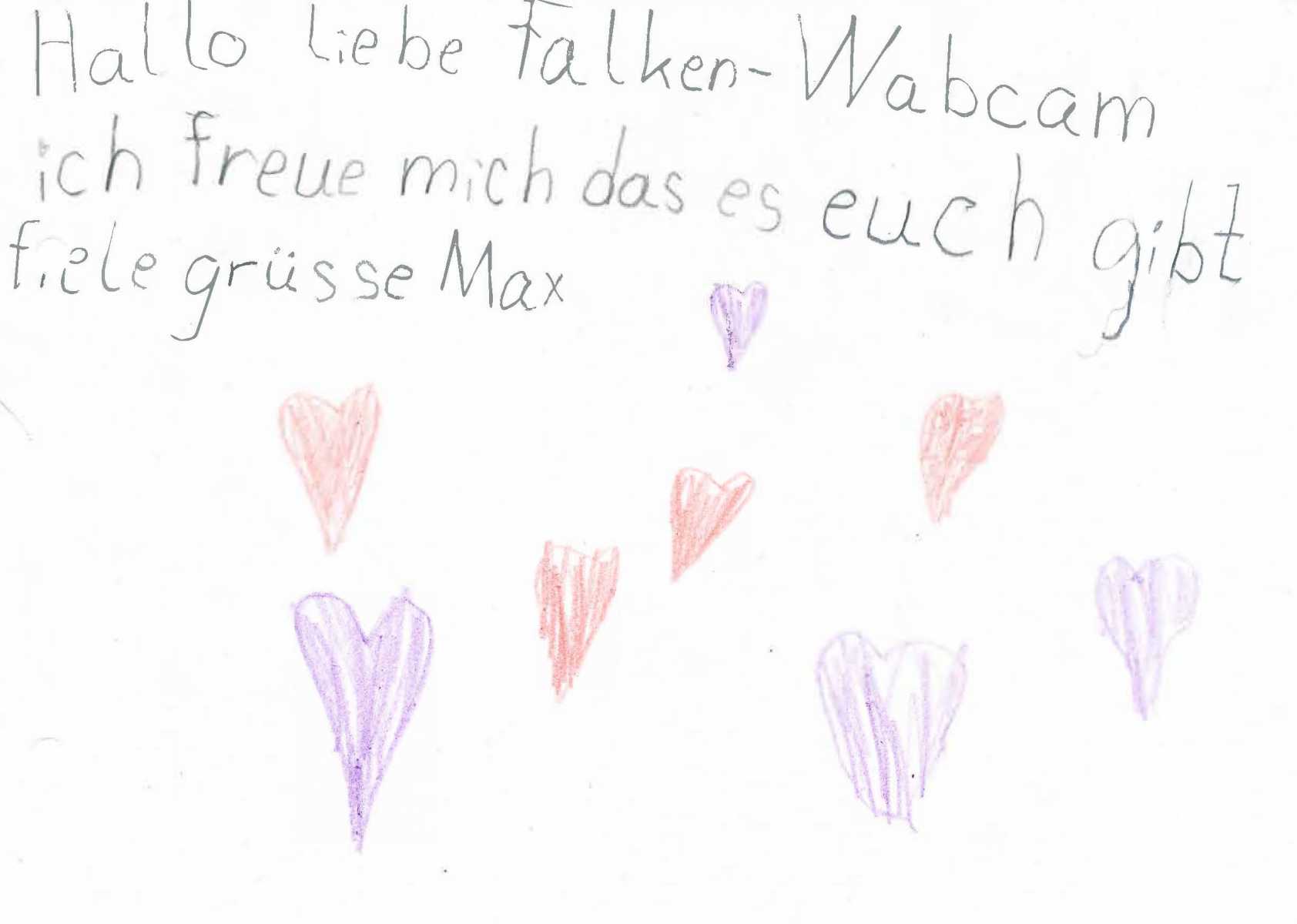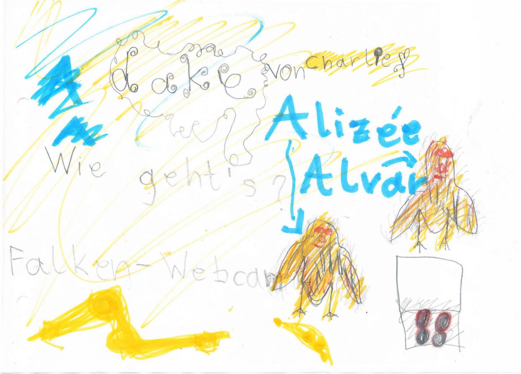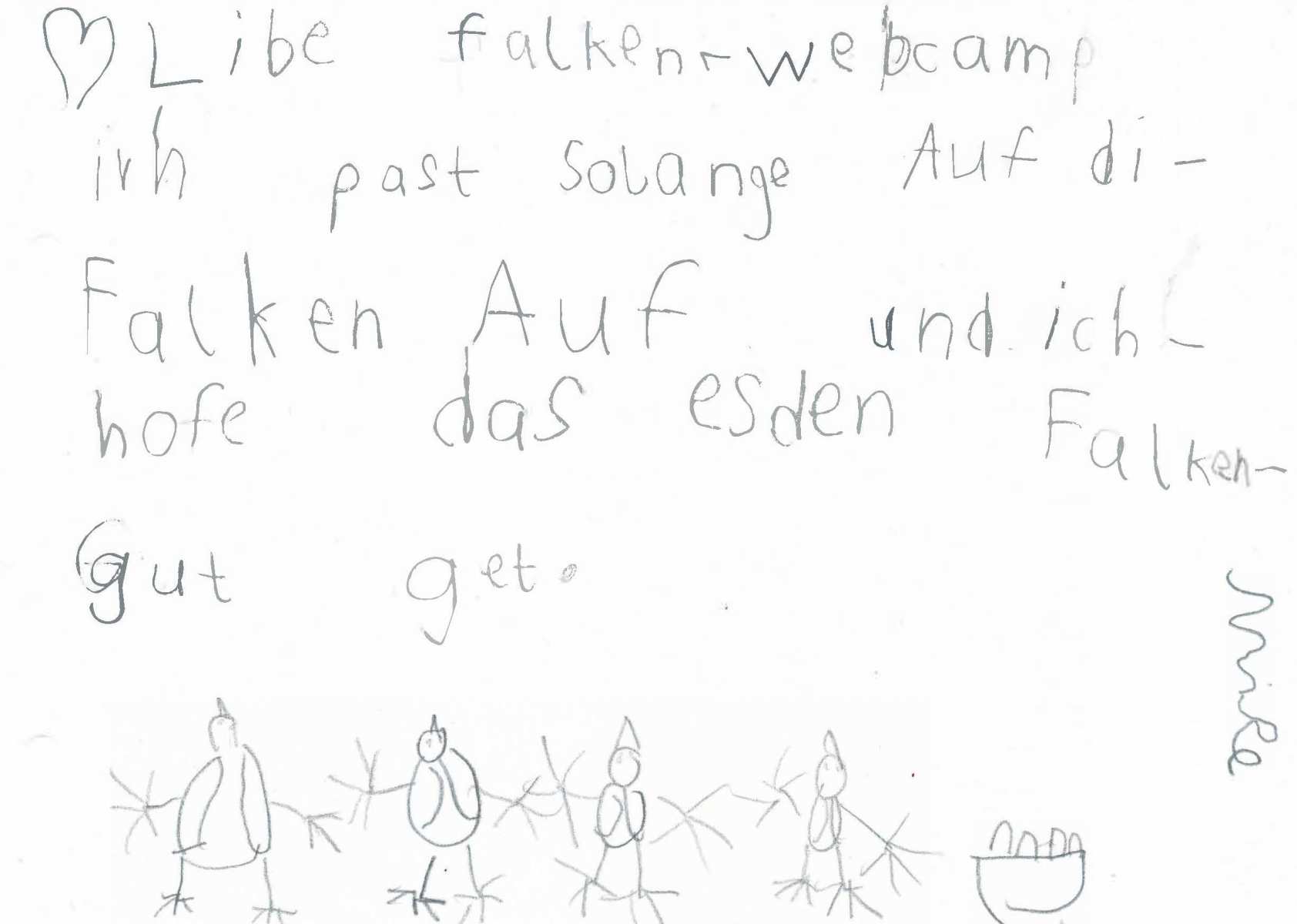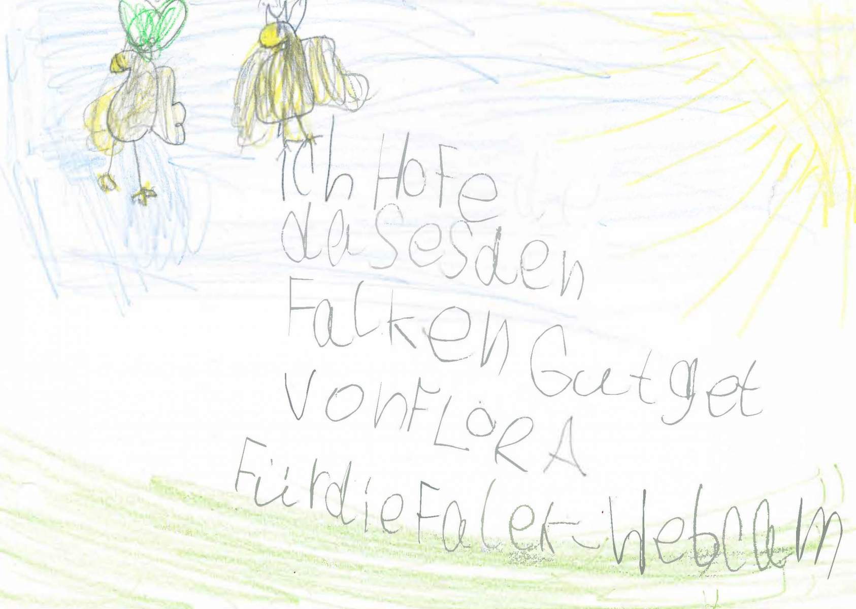 Zu Beginn der Sommerferien haben wir ein schönes Feedback bekommen. Die Falkenklasse 1c der Fichtelgebirgs-Grundschule in Berlin-Kreuzberg hat uns einen Brief geschickt. Sie schauen wärend des Unterichts regelmäßig bei unseren Wanderfalken zu und begleiten deren Entwicklung.
