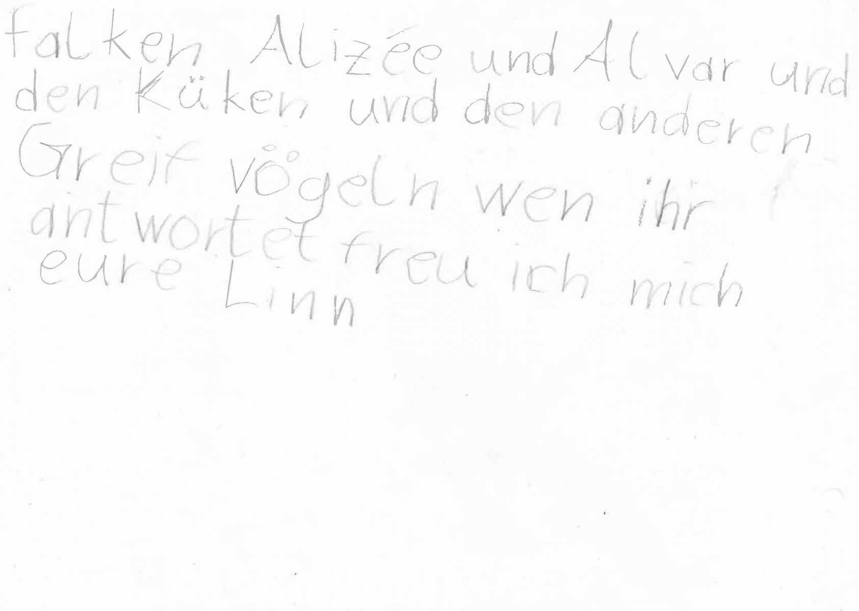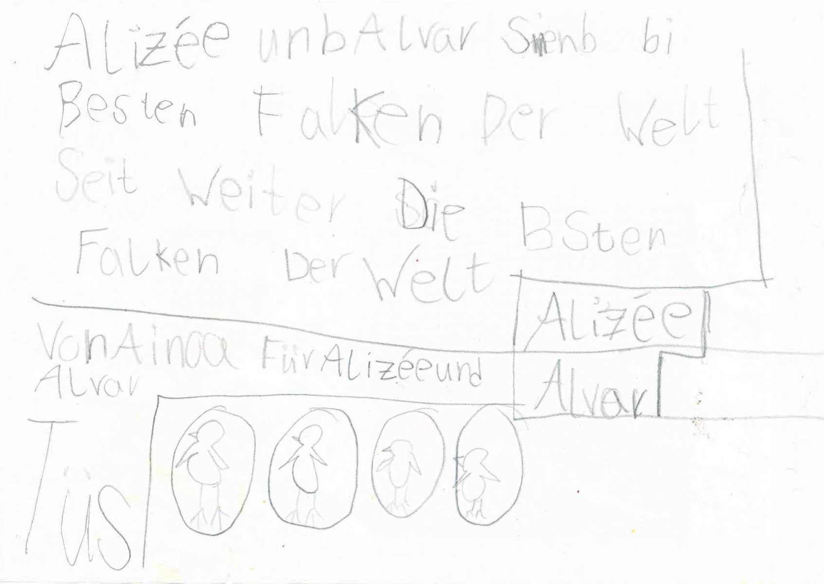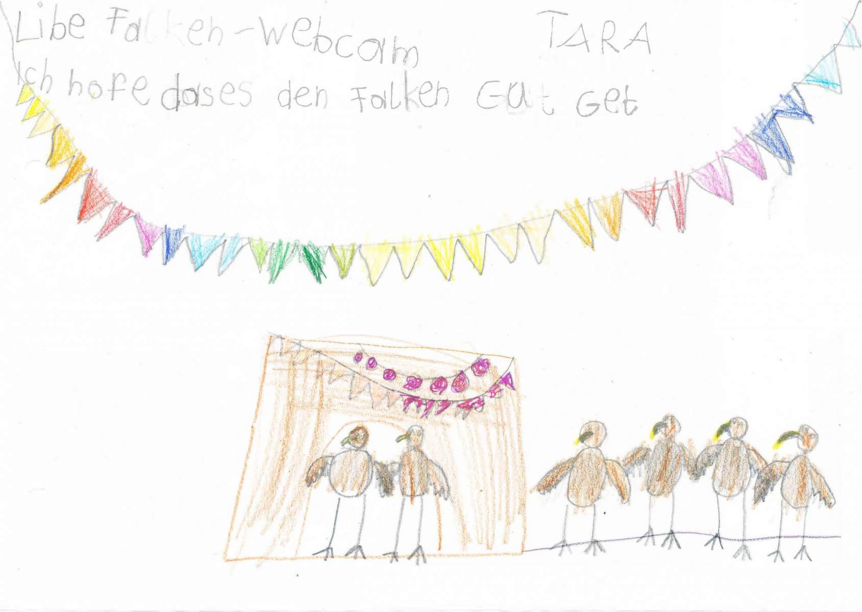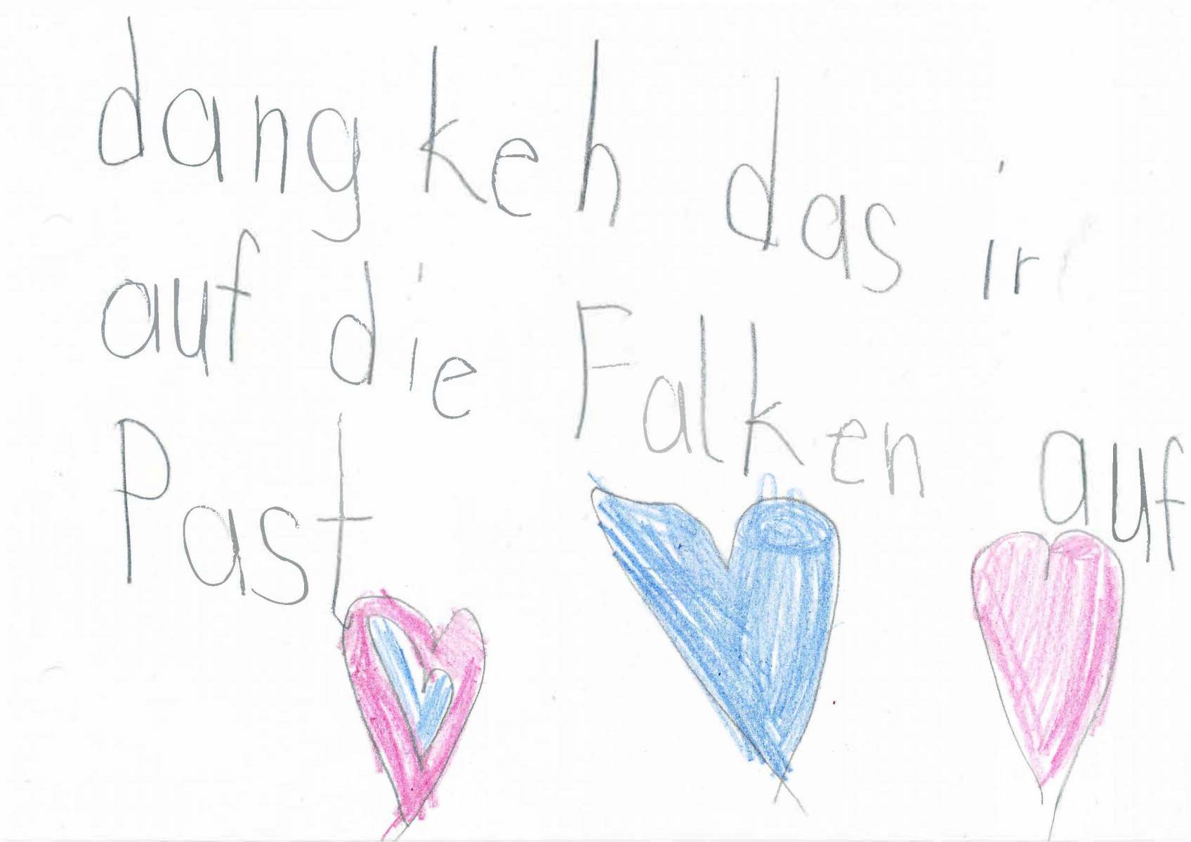 Zu Beginn der Sommerferien haben wir ein schönes Feedback bekommen. Die Falkenklasse 1c der Fichtelgebirgs-Grundschule in Berlin-Kreuzberg hat uns einen Brief geschickt. Sie schauen wärend des Unterichts regelmäßig bei unseren Wanderfalken zu und begleiten deren Entwicklung.